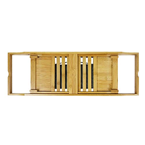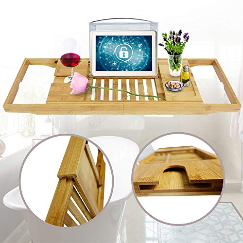 Multifunktional – Das Badewannenbretter hat auf der einen Seite einen Weinglas-halter,mit abnehmbarem Klammertuch für die Reinigung. Auf der anderen Seite kann ein großes Tablett Ihr Toilettenartikel, Duftkerzen und vieles mehr halten.