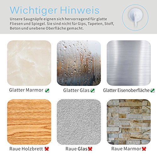 ★Wichtiger Hinweis: Unsere Saugnäpfe eignen sich hervorragend für glatte Fliesen und Spiegel. Sie sind nicht für Gips, Tapeten, Stoff, Beton und unebene Oberfläche gemacht.