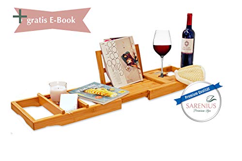 VIELSEITIG: Badewannenablage mit Tablet-Halter, wo auch Bücher problemlos Platz finden. Die Sarenius Badewannenbrücke verfügt zudem über eine Ablagemöglichkeit für Ihr Smartphone sowie eine praktische Weinglashalterung. Auch andere Getränkebehälter, Kerzen, kleinere Snacks und Pflegeprodukte finden auf der herausnehmbaren Ablage Platz.