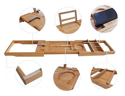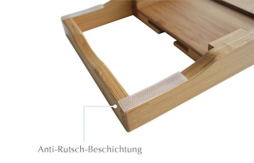 PRAKTISCH: Stabile, stufenlos verstellbare Badewannen-Ablage Bambus von 74,5 cm auf 109 cm. Die Anti-Rutsch Beschichtung an der Unterseite der Halterungen gibt dem Badewannenbutler einen besonderen Halt und bietet zudem zusätzlichen Schutz für Ihre Badewanne.