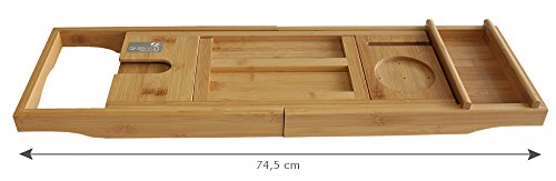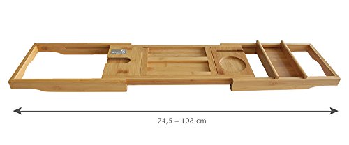 FLEXIBLE GRÖSSE: Das Badewannentablett hat die Maße 74,5 cm x 23 cm x 4 cm, ist ausziehbar auf 108 cm Länge und damit für jede Badewanne geeignet.