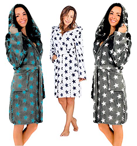 Brandsseller Damen Bademantel mit Sternen – in den Größen: S/M – L/XL – in der Farben: Anthrazit/Weiß