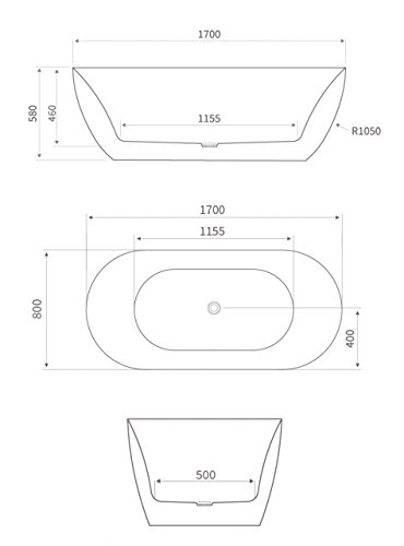 Maße: 1700 x 800x 580, Überlauf bereits vormontiert bereits installiert und enthalten, Form: Oval Standbadewanne