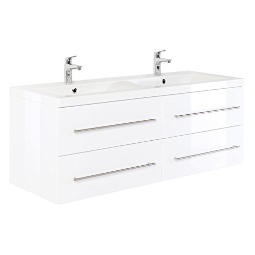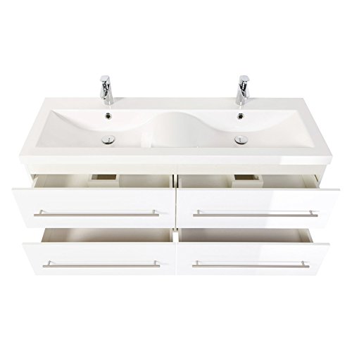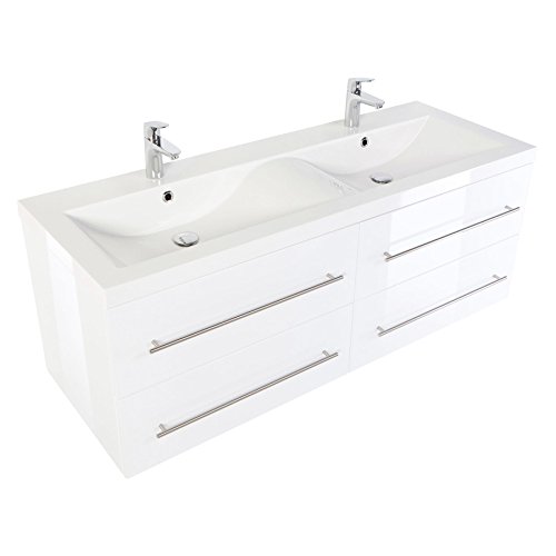 Doppel-Badmöbel in weiss hochglanz Exklusives, sehr hochwertiges Badmöbel in hochglanz-weiß. Dieser XL-Waschtisch besticht durch seine außergewöhnlich hohe Qualität und äußerst attraktives Design. Besonders stilvoll wirkt das Mineralguss-Doppel-Waschbecken, dessen Gestaltung in der Mitte, durch Wellen-Form inspiriert ist und aus einem Guss angefertigt ist. Somit verleiht es Ihrem Badezimmer akzentuierend ein sehr angenehmes Ambiente zum Wohlfühlen. Das Mineralguss-Doppel-Waschbecken vermittelt, durch die moderne und wunderschöne Formgebung, auf den ersten Blick, das es aus einem Guss angefertigt ist. Durch dieses auffällige Design zieht der Waschtisch auf Anhieb die Blicke der Betrachter auf sich. Selbstverständlich überzeugt nicht nur die Eleganz und Faszination, sondern ebenso die Funktionalität. Die 4 Softclose-Schubladen lassen sich, über die eleganten und praktischen Handgriffe aus Edelstahl, schnell und einfach verwenden, um den sehr geräumigen Stauraum in Anspruch zu nehmen. Basierend auf den ausgewählten Materialien sowie der äußerst kompetenten und hochwertigen Verarbeitung ist dieses raffinierte Badmöbel ein Highlight für jedes Badezimmer. Das, aus einem Guss gefertigte, Mineralguss-Doppel-Waschbecken, die 4 Softclose-Schubladen sowie die Handgriffe aus Edelstahl verfügen über sehr robuste, langlebige und pflegeleichte Eigenschaften. Dadurch liegt dieses einzigartige, faszinierende Ensemble absolut im Trend. Überzeugen Sie sich selbst von diesem Qualitäts-Produkt! Maße: Waschtischunterschrank 143,5/51,5/50,5 cm Höhe des Schrankes inkl. Waschbecken: 56,5 cm Waschbeckenbreite: 143,5 cm Die Waschtischtiefe: 50,5 cm Lieferumfang: Waschplatz mit 4 Softclose-Schubladen, 1 Mineralguss-Waschbecken Armaturen, Zuleitungen zum Wasserhahn, der Waschbeckenverschluss Popup und der Syphon gehören nicht zum Lieferumfang. Bitte beachten Sie, dass die Ware zerlegt geliefert wird. Eine leicht verständliche Aufbauanleitung liegt der Ware bei.