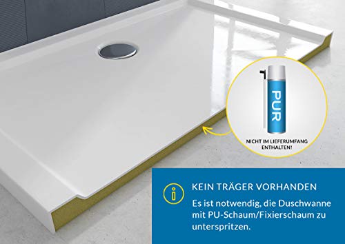 Die Duschwanne wird mit handelsüblichem PU-Schaum unterspritzt und auf den Boden geklebt.