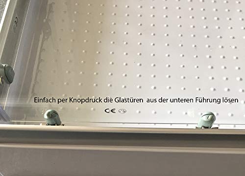 Die Türelemente aus 4 mm Einscheiben-Sicherheitsglas lassen zur einfachen Reinigung aus der unteren Führungsschiene ausklinken. Eleganter Stabgriff in Farbe Chromoptik, Profile aus Aluminium in der Farbe Alu Silber.