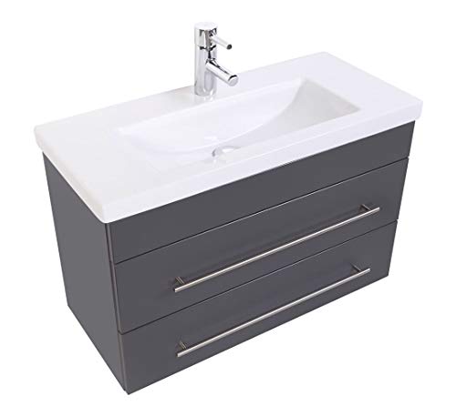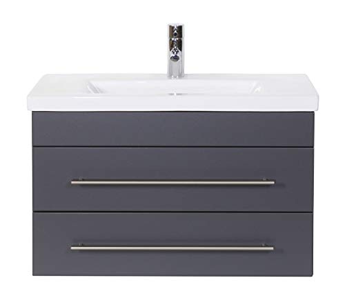 Badmöbel SlimLine akzentuiert und erfrischt das Badezimmer mit seinem eleganten Charakter: Eleganter Unterschrank mit schmaler Tiefe inklusive Waschbecken Badmöbel extra schmal für kleine Badezimmer: Waschtisch und Unterschrank und SoftClose-Schubladen. Maße: Badmöbel: (B/H/T) 79/48/35,5cm, Höhe des Schrankes inkl. Waschbecken: 52 cm, Waschbecken: (B/H/T) 80/14,2/36cm. Lieferumfang: 1 Unterschrank mit zwei Schubladen, 1 Keramik-Waschbecken ohne Überlauf. Nicht zum Lieferumfang gehören Armaturen, Zuleitungen zum Wasserhahn, der Waschbeckenverschluss Popup und der Syphon. Diese können gesondert bei uns erworben werden. Praktisches Badmöbel mit Waschbecken in Designer-Optik: Das wandhängende Designer Badmöbel Mars 800 SlimLine besticht mit einem Unterschrank in der Farbe anthrazit seidenglanz und einem formschön designten breiten Waschbecken in weiss. Zwei Schubladen nehmen die im Badezimmer benötigten Utensilien auf. Der Unterschrank ist somit gleichermaßen funktional wie modisch. Das breite Waschbecken lässt viel Flexibilität und Beweglichkeit zu. Materialien Möbel-Bauteile: Ihr neuer Waschtisch besteht aus stabilem 16mm MDF (mitteldichte Holzfaserplatte) Made in Germany der Firma HansaHolz. Dank der Markenbeschichtung aus Kunststoff (Renolit) und des ökologischen Klebers (Henkel) sind Ihre Badmöbel feuchtigkeitsbeständig und pflegeleicht. Ein herausragendes Qualitätsmerkmal unserer Badmöbel sind die Oberflächen, die über die Kanten und Ecken tiefgezogen und weich abgerundet sind. Innen ist das Möbelset mit weißem Melamin beschichtet. Umwelt: Unsere Möbel werden von uns nach modernsten Umweltstandards und Normen hergestellt. Qualitätsbadmöbel direkt ab Werk: Sie können auf unsere jahrelangen Erfahrungen als Möbelhersteller vertrauen und Qualitätsbadmöbel aus eigener Herstellung genießen. Handgriffe: Die Handgriffe sind aus schwerem, matt gebürsteten Edelstahl gefertigt, die auch in hochwertigen Küchen verbaut werden. Soft-Close für Schubladen sowie Türen: Für