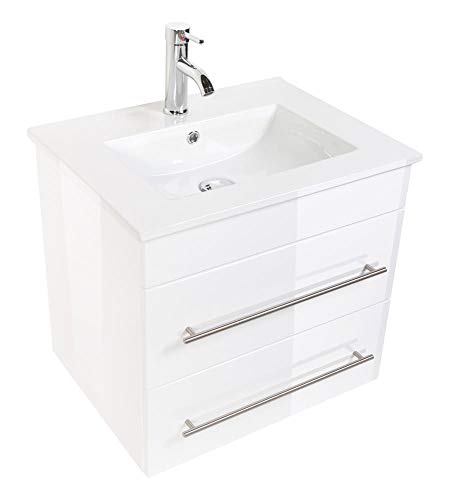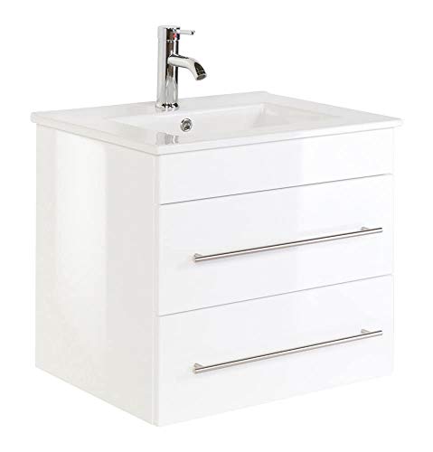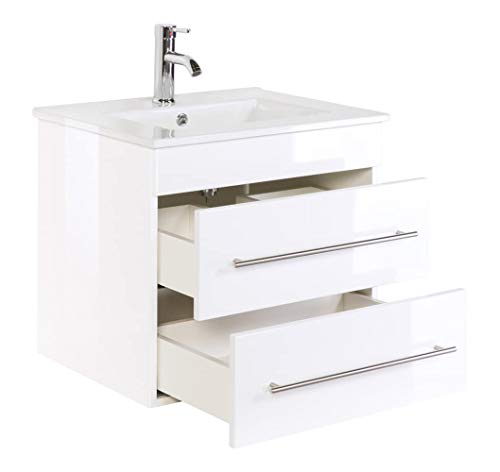 Badmöbelset Milet [inkl. Waschbeckenunterschrank mit 2 Schubladen, Waschbecken] Das Designer Badmöbel Milet weiss hochglanz ist ebenso elegant designt, wie ausgeklügelt durchdacht. Jede Softclose Schublade lässt sich sanft bewegen und präsentiert sich im Badezimmer mit geräumigen Staufächern. Das Badmöbel ist mit einem aufgesetzten Keramik-Waschbecken versehen, das eine elegante niedrige Auflagekante besitzt. Maße: Waschtischunterschrank: (B/H/T) 59/58/45,5cm, Höhe des Schrankes inkl. Waschbecken: 59,6 cm, Breite des Schrankes inkl. Waschbecken: 61,5cm, Waschbeckenbreite: 61,5cm, Die Waschtischtiefe: 46,5cm. Lieferumfang: 1 Unterschrank mit 2 Softclose-Schubladen, 1 Keramik-Waschbecken mit Überlauf. Nicht im Lieferumfang enthalten sind beispielsweise Armaturen, Zuleitungen zum Wasserhahn, der Waschbeckenverschluss Popup und der Syphon. Diese Artikel können aber gesondert bei uns erworben werden Materialien Möbel-Bauteile: Ihr neuer Waschtisch besteht aus stabilem 16mm MDF (mitteldichte Holzfaserplatte) Made in Germany der Firma HansaHolz. Dank der Markenbeschichtung aus Kunststoff (Renolit) und des ökologischen Klebers (Henkel) sind Ihre Badmöbel feuchtigkeitsbeständig und pflegeleicht. Ein herausragendes Qualitätsmerkmal unserer Badmöbel sind die Oberflächen, die über die Kanten und Ecken tiefgezogen und weich abgerundet sind. Innen ist das Möbelset mit weißem Melamin beschichtet. Umwelt: Unsere Möbel werden von uns nach modernsten Umweltstandards und Normen hergestellt. Qualitätsbadmöbel direkt ab Werk: Sie können auf unsere jahrelangen Erfahrungen als Möbelhersteller vertrauen und Qualitätsbadmöbel aus eigener Herstellung genießen. Handgriffe: Die Handgriffe sind aus schwerem, matt gebürsteten Edelstahl gefertigt, die auch in hochwertigen Küchen verbaut werden. Soft-Close für Schubladen sowie Türen: Für maximalen Komfort statten wir die Schubladen aus mit hochwertigen Soft-Close Schienen der Marke GTV. Auf den letzten Zentimetern ziehen sie sich von allein in