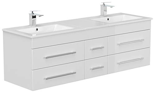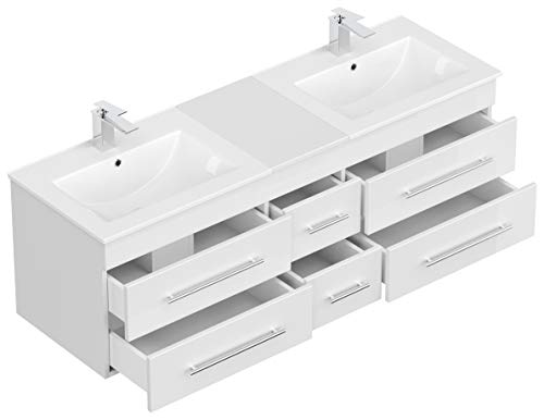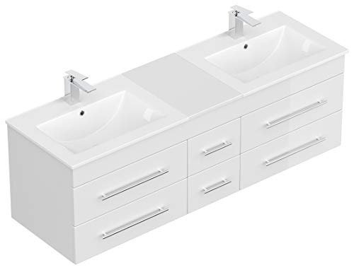 Badmöbel doppelt Roma XL 153cm mit 6 Softclose Schubladen [inkl. 1 Waschbeckenunterschrank und 2 Waschbecken] Maße: Badmöbel inkl. Waschbecken (B/H/T) 153/50,3/47 cm, Waschtischunterschrank ohne Becken (B/H/T) 150,2/49,6/46,5cm, Waschbecken (B/T) 61,5/46,5cm. Lieferumfang: 1 Unterschrank mit 6 Softclose Schubladen, 2 Keramik-Waschbecken mit Überlauf. Nicht zum Lieferumfang gehören Armaturen, Spiegel, Zuleitungen zum Wasserhahn, der Waschbeckenverschluss Popup und der Syphon. Diese können gesondert bei uns erworben werden. Doppelbadmöbel in edlem Design und hochwertiger Qualität “Made in Germany”: Wer in einem geräumigen Badezimmer auf edles Design seiner Badmöbel Wert legt, findet mit der Serie Roma XL in Weiss hochglanz eine zeitlose Einrichtung für zwei Personen. Sechs geräumige Schubladen bieten praktische Vorzüge und die hängende Anbringung der Designer Badmöbel ist optisch überaus reizvoll. Materialien Möbel-Bauteile: Ihr neuer Waschtisch besteht aus stabilem 16mm MDF (mitteldichte Holzfaserplatte) Made in Germany der Firma HansaHolz. Dank der Markenbeschichtung aus Kunststoff (Renolit) und des ökologischen Klebers (Henkel) sind Ihre Badmöbel feuchtigkeitsbeständig und pflegeleicht. Ein herausragendes Qualitätsmerkmal unserer Badmöbel sind die Oberflächen, die über die Kanten und Ecken tiefgezogen und weich abgerundet sind. Innen ist das Möbelset mit weißem Melamin beschichtet. Umwelt: Unsere Möbel werden von uns nach modernsten Umweltstandards und Normen hergestellt. Qualitätsbadmöbel direkt ab Werk: Sie können auf unsere jahrelangen Erfahrungen als Möbelhersteller vertrauen und Qualitätsbadmöbel aus eigener Herstellung genießen. Handgriffe: Die Handgriffe sind aus schwerem, matt gebürsteten Edelstahl gefertigt, die auch in hochwertigen Küchen verbaut werden. Soft-Close für Schubladen sowie Türen: Für maximalen Komfort statten wir die Schubladen aus mit hochwertigen Soft-Close Schienen der Marke GTV. Auf den letzten Zentimetern ziehen sie sich von allein