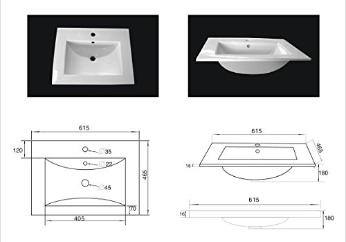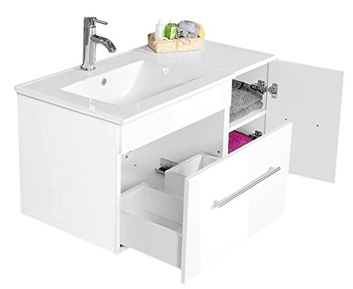 Badmöbel weiß hochglanz sind stylisch und doch überaus praktisch Der Badmöbel-Unterschrank der Serie Fortuna in Hochglanz weiß besticht durch sein edles Design und passt perfekt in jedes Badezimmer. Die Badmöbel Fortuna weiß werden alle in Deutschland hergestellt und ab Werk geliefert. Sie werden aus qualitativ hochwertigem Material gefertigt , sind zeitlos und halten ein Leben lang. Der Waschtisch ist aus mitteldichter Holzfaserplatte hergestellt und äußerst stabil. Außen ist der Unterschrank, mit Waschbecken, mit einer speziellen Markenbeschichtung veredelt. Weiß Hochglanz lässt Ihr Bad immer hygienisch und sauber erscheinen. Verklebt ist der Unterschrank mit einem ökologischen Kleber, das ist umweltschonend. Das Innere des Waschtisches ist mit Melanin beschichtet, deshalb lässt er sich auch so gut reinigen. Das Waschbecken gehört mit zur Lieferung und vollendet das Design des Badmöbels. Hightech Badmöbel mit gutem Aussehen gepaart Der Waschtisch mit Waschbecken besteht aus zwei Elementen. Der Seitenschrank mit einer Tür und zwei Innenfächern, bietet Ihnen genug Platz zur Aufbewahrung von Handtüchern oder Badeutensilien. Der Unterschrank hat eine große Schublade, die mit der neuen soft close Technik ausgestattet ist. So schließt sie ganz leise und leicht. Die Griffe an Tür und Schublade sind aus matt gebürstetem Edelstahl gefertigt. Überzeugen Sie sich einfach persönlich von der Einzigartigkeit des Badmöbels Stückes. Maße: Waschtischunterschrank: (B/H/T) 90/48/45,5cm (Gesamtmaße), besteht aus 1 Modul 60/49,5/45,5cm und ein Schrank 30/49,5/45,5cm Höhe des Schrankes inkl. Waschbecken: 35,5 cm Waschbeckenbreite: 61,5cm Die Waschbeckentiefe: 46,5cm Lieferumfang: 1 Unterschrank mit 1 Soft-Close Schublade 1 Seitenschrank mit 1 Tür (2 Komfort-Fächer) 1 Keramik-Waschbecken mit Überlauf Befestigungsmittel Armaturen, Spiegel, Zuleitungen zum Wasserhahn, der Waschbeckenverschluss Popup und der Syphon gehören nicht zum Lieferumfang, können aber gesondert erworben werden.