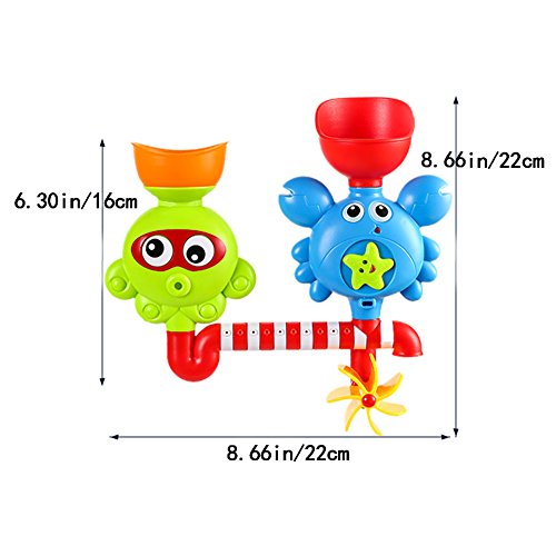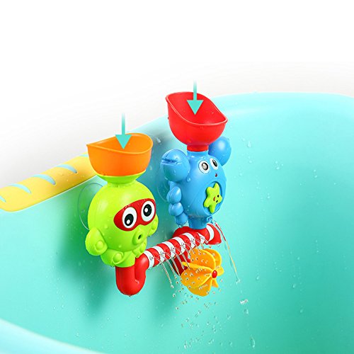 Bath Time Fun:Cute design and pretty color toy is very attractive for kids to play.Now bathing time is full of fun. BPA FREE:The bath toy is made of quality material and well constructed .With smooth surface,completely safe and durable for the child to play. Play and Learn :This is a great combo of different toys and functions.During the showing time, your baby will develop hand-eye coordination, shape and color recognition,also enhance children ‘s thinking and creativity. Tons of Fun :It sticks