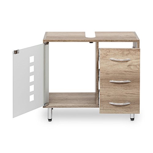 Moderner, platzsparender Waschbeckenunterschrank für kleine Räume mit 3 Schubladen, einer Glastür und Aussparung für Siphon