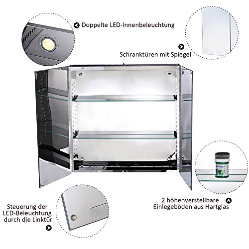 Unser beleuchteter Spiegelschrank ist Ordnungshelfer und Blickfang für Ihr Badezimmer. Im Inneren des Schranks bieten zwei höhenverstellbare Einlegeböden genügend Stauraum für alle wichtigen Badutensilien. Sobald Sie die linke Schranktür öffnen, wird die LED Beleuchtung automatisch aktiviert. So haben Sie alles im Blick. Und dank seines Edelstahl Gehäuses ist Ihr Badspiegel rostbeständig und langlebig.