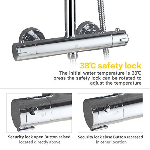 1.Das Thermostat hat eine Sicherheitssperre – Verbrühungsschutz bei 38°,dass Kinder die Wassertemperatur zu heiß einstellen.