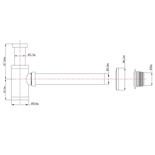 Endstück (wo Verbindung zu Ablaufgarnitur) des Röhrensifon ist 150mm lang, kann 80mm justiert, Anschlussmaß: 1 1/4 Zoll und Ø 32mm