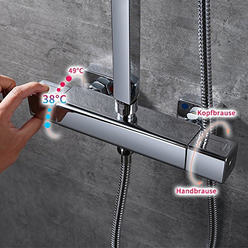 Homelody Thermostat Duschsystem Regendusche Eckig Duscharmatur Duschset Duschsäule mit 304 Edelstahl Kopfbrause, chrom