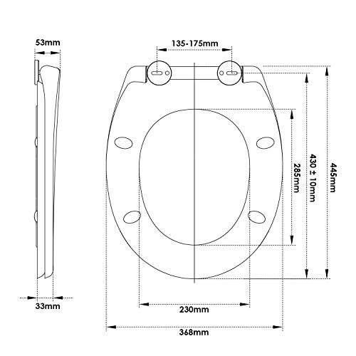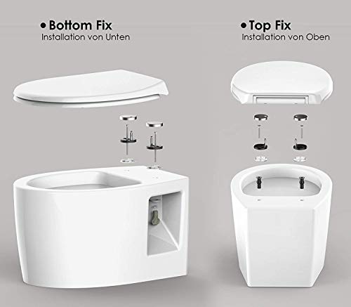 2 MONTAGEMETHODE: Die WC-brille bietet 2 Montagesmöglichkeiten an, d.h von Oben und von Unten. Es passt nicht nur an den traditionellen Toiletten, sondern auch an den Modernen. Die Größe des WC Sitz ist 445* 368* 53 mm. Homfa Toilettensitz Befestigungslochabstand Einstellbereich ist 135~175 mm. Max. Belastbarkeit des Ringsitzes ist 150 kg.Installation.
