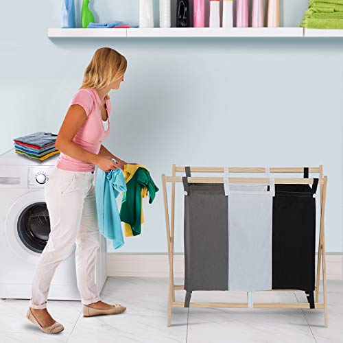 ⭐⭐⭐⭐⭐ GERÄUMIG: Wäschesortierer aus Holz und Polyestergewebe mit den Abmessungen 85/43 / 81cm; Fächer: schwarz, weiß und grau