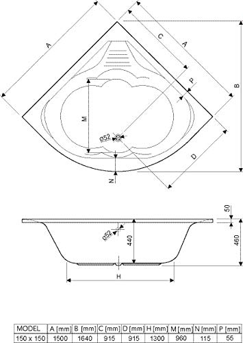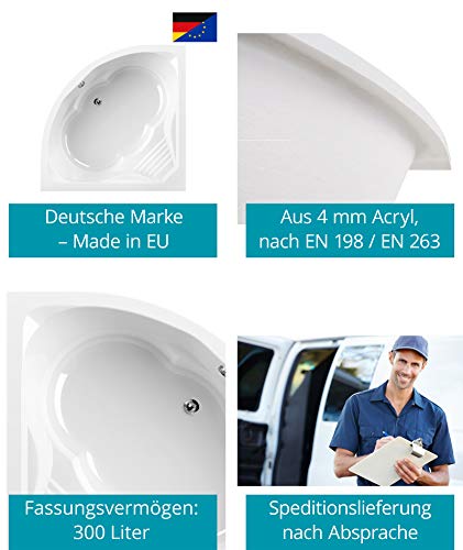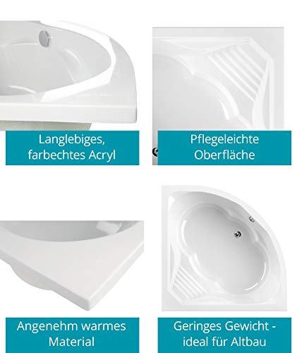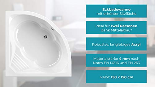 GROSSE DUOBADEWANNE: Die Eckbadewanne bietet mit 150 x 150 cm herrlich viel Platz, dank mittigem Ablauf auch für ein Bad zu zweit. Die Acrylwanne mit 130 cm Liegefläche fasst 300 Liter Wasser.