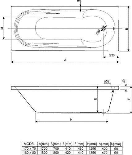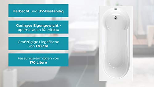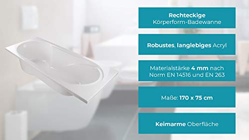 STANDARD-MAß & KÖRPERFORM: Die 170 x 75 cm große Rechteck-Badewanne fasst 170 Liter Wasser und ist ergonomisch geformt. So erfahren Sie während Ihres Schaumbads sicheren Halt auf der großzügigen Liegefläche von 130 cm.