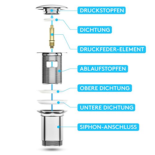 EXTREM LEICHT ZU REINIGEN – Sie können den oberen Druckstopfen der Abflussgarnitur ganz einfach herausdrehen und mit einem Tuch reinigen. Ein- und Ausbau mit wenigen Handgriffen in 10 Sekunden!