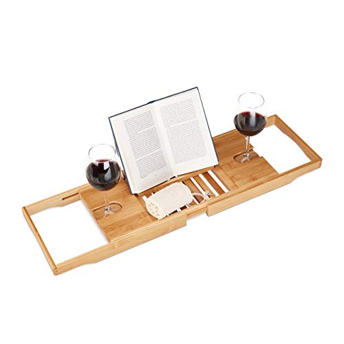 Relaxdays Badewannentablett ausziehbar, Bambus Badewannenablage m. Buchstütze, Glashalter, verstellbar 70 – 105cm, natur