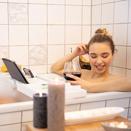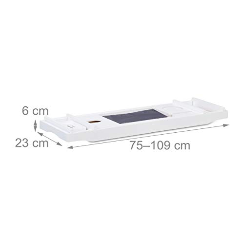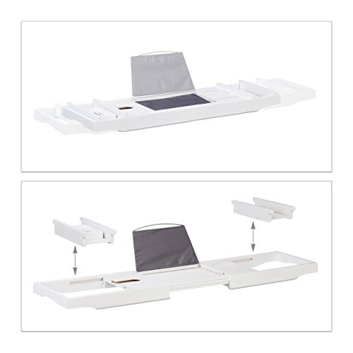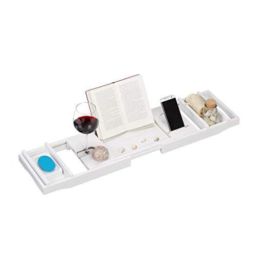 Relaxdays Bambus Badewannenablage, ausziehbar, Weinhalter, Buchstütze, Seifenablage, Badewannenaufsatz, 75-109 cm, weiß…