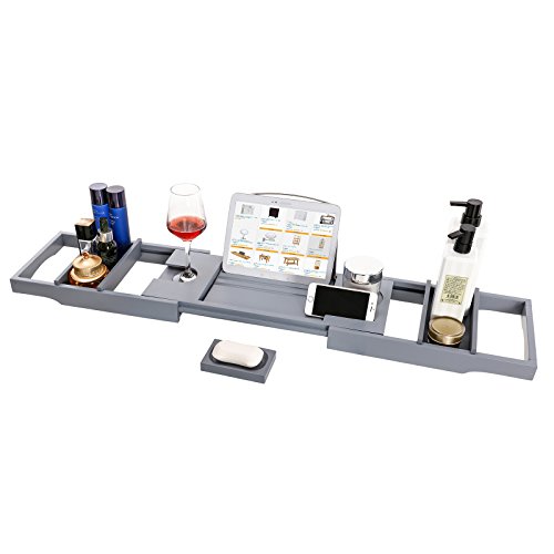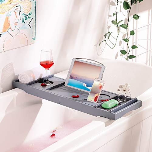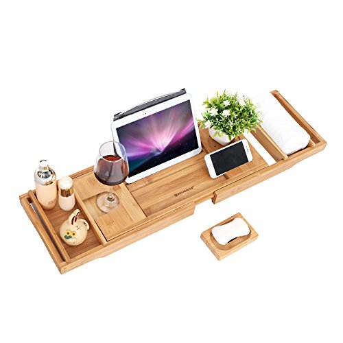 SONGMICS ausziehbare Badewannenablage aus Bambus verstellbares Badewannenbrett Badewannen Ablagen, mit Getränkehalter…
