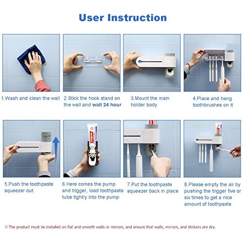 Multifunktionales Familiendesign. Perfekt für Familien, es können 5 Zahnbürsten aufbewahrt werden, damit auch elektrische Zahnbürsten verwendet werden können. eingebaute ultraviolette (uv) strahlung lässt es als uv zahnbürstenhalter fungieren; Es ist auch ein Zahnpastaspender mit Vakuumpumpe, der eine bestimmte Menge an Zahnpasta herausdrückt, die Sie benötigen, kein Abfall und hygienischer.