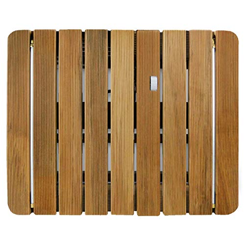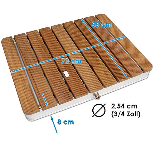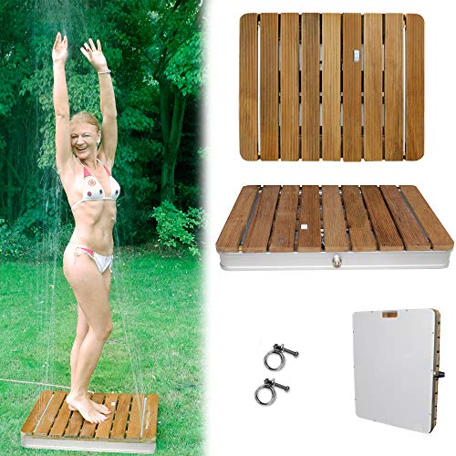 Innovative Gartendusche mit rechteckiger, massiver Teak-Holz Bodenplatte – sorgt an heißen Sommertagen für eine erfrischende und wohltuende Abkühlung unter freiem Himmel & erfrischenden Wasser-Spaß für Kinder, Erwachsene & Vierbeiner – robust und wetterbeständig