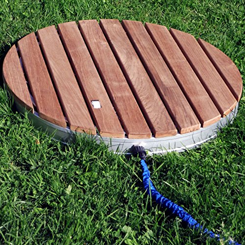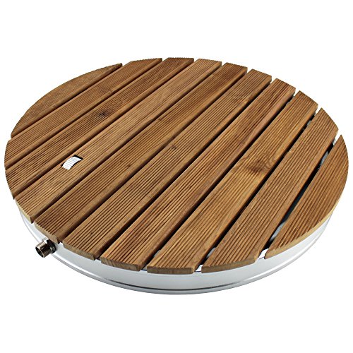 Innovative Gartendusche mit runder, massiver Teak-Holz Bodenplatte – sorgt an heißen Sommertagen für eine erfrischende und wohltuende Abkühlung unter freiem Himmel & erfrischenden Wasser-Spaß für Kinder, Erwachsene & Vierbeiner – robust und wetterbeständig