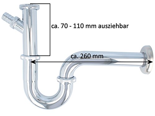 PROFI – Röhrensiphon – Geruchsverschluss Mit Geräteanschluss zur Montage eines Wasch- oder Spülmaschinenablaufschlauches. Material: Messing hochglanzverchromt 1 1/4 Zoll Anschluss (Standard) für Waschbecken Geräteanschlusstülle mit Ø 19 mm Kein Plastik, alle Teile aus hochwertigem Messing Rohrdurchmesser: 32 mm Inkl. 65 mm Rosette Tauchrohr mit 120 mm, kürzbar Geprüft nach DIN 16545 + EN 274 Weitere Maße in den Bildern!