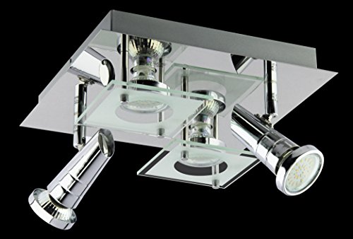Die LED Decken-Leuchte besticht neben teilsatiniertem Glas mit 4 warmweiß strahlenden Licht-Spots, 2 von 4 Deckenspots I Spotlights sind individuell dreh- und schwenkbar – in Chrom und satiniertes Glas