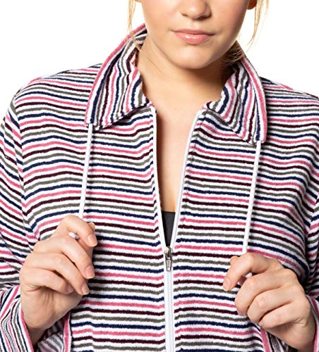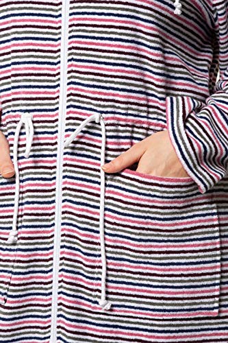 Länge: ca 95 – 105 cm. Bademantel aus Ringelfrottee. Zipper und 2 Taschen. Tunnelzug am Stehkragen und in der Taille. Langarm Hausmantel. Bequemer Bademantel aus Ringelfrottee mit Zipper und 2 Taschen. Tunnelzug am Stehkragen und in der Taille sowie Langarm. Per Maschinenwäsche waschbar.