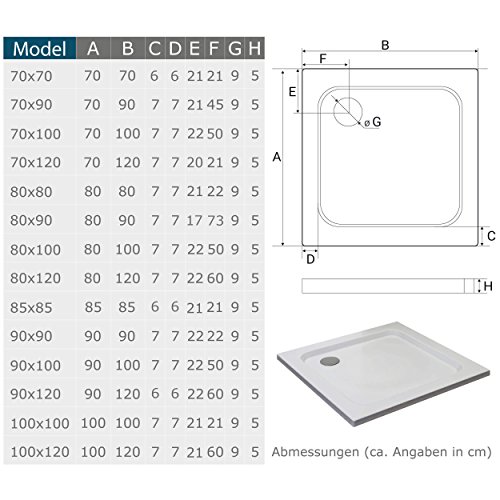 [ ARTIKELMERKMALE ] Selbsttragender Rahmen, Montage mit Duschwannenfüßen (nicht im Lieferumfang), Farbe: Schneeweiß, Hochglanz, Material: Sanitär-Acryl, glasfaserverstärkt, Oberfläche: Hochwertiges ABS, Wannentiefe: ca. 20mm (mit Gefälle für reibungslosen Abfluss), Durchmesser Ablaufloch: 90mm (DIN-Anschluss), Max. Belastbarkeit 200kg.