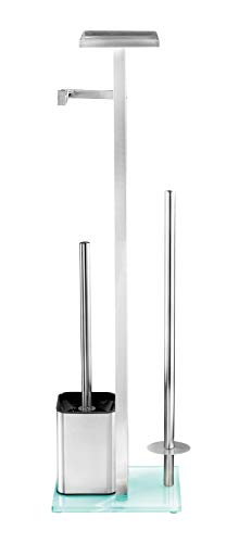 Verleihen Sie Ihrem Bad einen neuen Look mit der hochwertigen Stand WC-Garnitur Debar. Mit ihren klaren und einzigartigen Formen präsentiert sich die WC-Garnitur garantiert von ihrer besten Seite. Doch der Toilettenpapierhalter der Bad-Serie Debar überzeugt nicht nur mit seinem formschönen Design aus modernem Vierkantrohr. Auch das Material aus rostfreiem, mattiertem Edelstahl kann sich zweifelsohne sehen lassen. Sie ist eine praktische 4 in 1 Kombination bestehend aus einem offenen WC-Bürstenhalter, einem Toilettenpapierrollenhalter für die sofortige Entnahme und einem separaten Ersatzrollenhalter für die Aufbewahrung von bis zu 3 weiteren Rollen. Zusätzlichen Komfort bietet die praktische Ablage für eine Feuchttücher-Box oder andere Utensilien, z.B. Handy, etc. Natürlich ist die Ablage rutschhemmend beschichtet. Ein quadratischer Standfuß aus weißem Sicherheitsglas sorgt durch seine perfekte Größe für sicheren Stand. Im Lieferumfang ist eine WC-Bürste mit auswechselbarem, schwarzem Bürstenkopf von Ø 8,5 cm enthalten. Mit dieser praktischen WC-Bürste kann das WC gründlich gereinigt werden. Bei Nichtgebrauch kann diese anschließend in dem Behälter aus satiniertem Sicherheitsglas verstaut werden. Die Bürste gewährleistet durch ihre strapazier- und anpassungsfähigen Borsten eine zuverlässige Nutzung. Erfreuen Sie sich ebenfalls an dem stilvollen Handtuchbutler der Serie Debar und bringen Sie so den Lifestyle in Ihr Badezimmer.