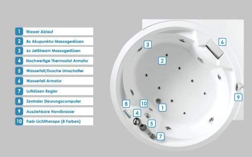 Die Pumpe hat einen integrierten Trockenlaufschutz! Die Rückseiten der Badewanne sind offen für Anschlüsse und um sie problemlos durch Türen zum Aufstellort zu verbringen; Ausstattung: Heizung, Computer, Unterwasserlicht, JetStream Düsen, Verchromte Armaturen, Ozon Desinfektion, Radio+Lautsprecher. » Power Heizung garantiert langes und gemütliches Badevergnügen. » Bedienen Sie Ihre Luxus Massage Badewanne einfach über den integrierten Computer. » 14 Massagedüsen: Die Kombination aus 6 kräftigen JetStream-Düsen und 8 Boden-Zyklon-Massagedüsen bietet eine überzeugende und entspannende Massagewirkung. » Für optimale Massagewirkung können Sie die Richtung jeder einzelnen JetStream-Düse einzeln einstellen. Sie lösen Verspannungen. Über einen Drehregler können Sie den Wasserdruck individuell nach Ihren Bedürfnissen einstellen. » Mit 8 Boden-Zyklon-Massagedüsen erleben Sie in Ihrer Massage Badewanne das 100% Whirlpool-Feeling! » Die integrierte Unterwasserbeleuchtung sorgt für das richtige Ambiente und verleiht dem Whirlpool bei Dunkelheit eine besondere Optik. Zusätzlich bilden die Lampen eine Farblicht-Therapie. Die 8 unterschiedlichen Farben helfen Ihnen je nach Gemütszustand, sich optimal zu entspannen. » Die leicht zu bedienenden Armaturen sind mir Ihrer verchromten Oberfläche elegant und dezent zugleich. Mit einem Dreh am Funktionswahlhebel wechseln Sie kinderleicht zwischen Wanneneinlauf und Handbrause. » Natürlich ist auch der Abfluss mit samt Überlaufsystem im Lieferumfang enthalten. Sowohl die Abflusskappe als auch der Drehregler zum Öffnen und Schliessen sind verchromt. Der Whirlpool fasst minimal ca. 200 Liter Wasser. » Die integrierte Handbrause mit ausziehbarem Brauseschlauch macht dieses Whirlpool absolut alltagstauglich. Eine integrierte Halterung nimmt die Handbrause auf. » Alle Anschlüsse (Wasser, Abfluss, Strom) sind flexibel. Der Whirlpool passt somit problemlos auf vorhandene Anschlüsse.
