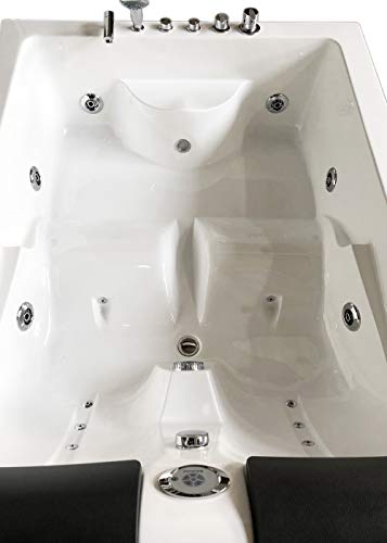 BADEWANNE MIT WASSERSTRAHLMASSAGE FARBTHERAPIE Modell “MIMI” 170 X 132 cm FÜR 2 PERSONEN – Dimensionen der Badewanne: Basis 170 x 132 cm H 65 cm Pumpe 1,5HP Wasser System zur Desinfektion und Sterilisation 2 Kopfstützen 14 Wasserstrahldüsen Schutzsystem gegen elektrischen Schlag(automatische Sicherung) Bedienfeld (Computer) Radio 1 multifunktionale Dusche 1 Kommutator Wasserdruckregler Wasseransaugung Amerikanisches Modell Wasserfall eingeschlossen Wasserzirkulation 1 große Leuchtdiode Lichter 1 Lautsprecher Armaturen eingeschlossen Weiß hohe Qualität Badewanne aus Sanitär-Acryl Gewicht: 100 kg Struktur aus Stahl