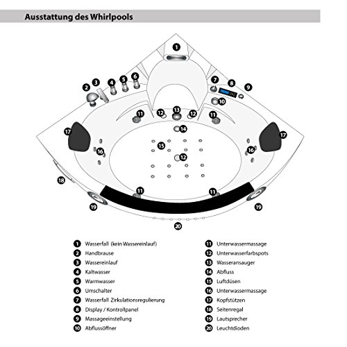 Massagedüsen seitlich 12x Jet Düsen für Wassersprudel / 16 Air-Jets für Luftsprudel im Boden / Komplette Armaturen mit herausziehbarer Brause / passive Restwasserentleerung / Wasserstandssensor und natürlich Ozondesinfektion