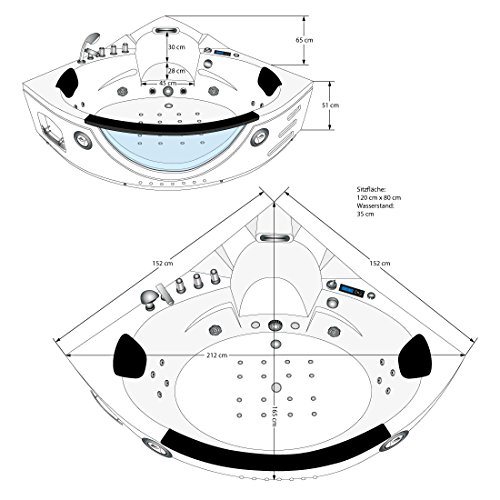 Steuerungsdisplay für alle elektrischen Funktionen / UKW-Radio mit Lautsprecher / 3x Farblichtspot mit 7 Farben unter Wasser / 2 schwarze Nackenkissen
