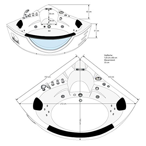 152cm x 152cm x 65cm (LxBxH) / Wasserfall, Ab- und Überlaufgarnitur, Auslieferung komplett anschlussfertig inkl. Schürze