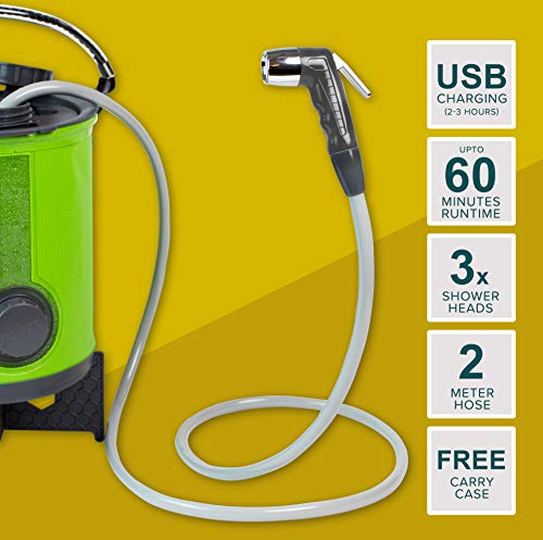 ✔️ TRAGBAR – Diese Dusche besitzt eine Pumpe, die über einen USB-wiederaufladbaren Akku betrieben werden kann, wenn kein Anschluss an das Stromnetz möglich ist. Die Laufleistung beträgt 45 bis 60 Minuten. Wenn kein Leitungswasser zur Verfügung steht, kann das Wasser aus jedem stehenden Gewässer bezogen werden. Die perfekte tragbare Dusche.